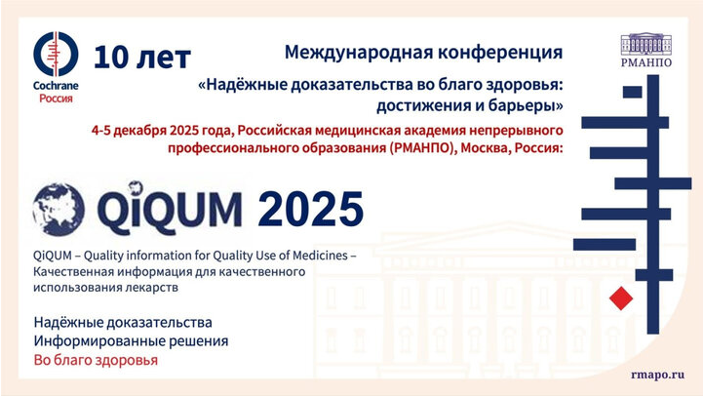·      Международная конференция 4-5 декабря 2025 года «Надёжные доказательства во благо здоровья: достижения и барьеры» (QiQUM 2025), Москва